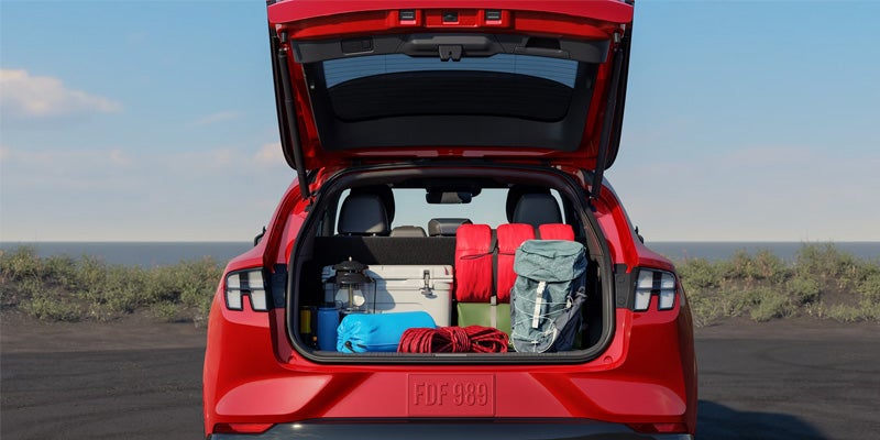 The 2026 Mustang Mach-E pairs family-friendly practicality with sports car-inspired style, creating an exterior and interior that harmonize contradictions into a cohesive design. Its coupe-like silhouette, tri-bar taillamps, and classic Pony badge give a nod to Mustang heritage while signaling a forward-looking electric aesthetic. Ford engineers also carved out clever storage solutions, such as a spacious cargo area with up to 59.7 cu ft of space when the second row is folded and an available drainable frunk that doubles as a cooler. Optional appearance packages like the Panoramic Roof and California Special further enhance visual presence and customization. Aerodynamic elements such as underbody shields and a splitter help refine both form and function.